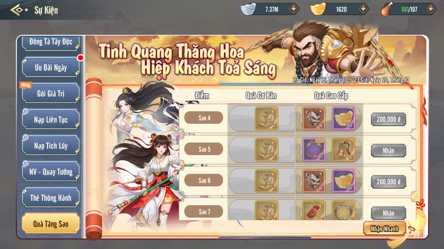 - Quà cao cấp: Tùy theo mốc quà mà Đại Hiệp cần phải mua gói để nhận.